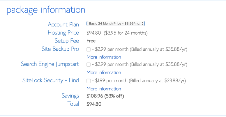 Each Bluehost web hosting package comes with