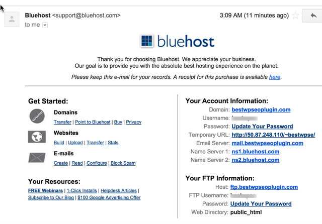 When you check your email box, you will see a confirmation message with all the login details for the web hosting account that you just purchased. One important thing that will not be included in this email is the password you selected in the last step — and this is for your own security.